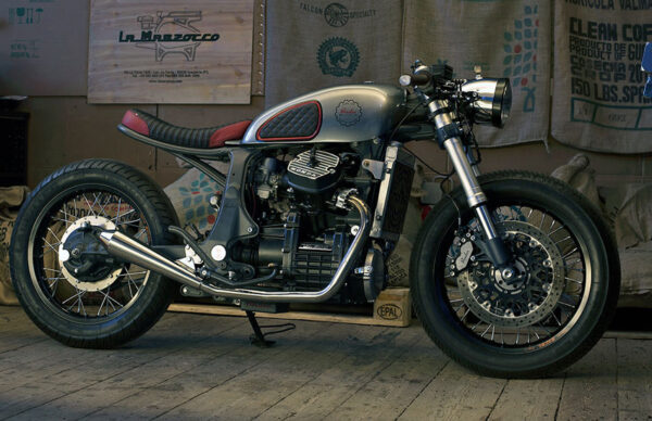 This is Osvaldo Coutinho and Alex Santos’ third bike for the Yard Built series. Built to celebrate 30 years of Yamaha’s muscle bike, this VMAX was designed to be quick and slippery. The aerodynamic metal fairing is handcrafted and blends perfectly with the workshop’s signature monocoque tank, seat and tail unit. Of course, the real fuel cell resides below the seat, so the false unit houses electrical necessities such as a slick digital display.